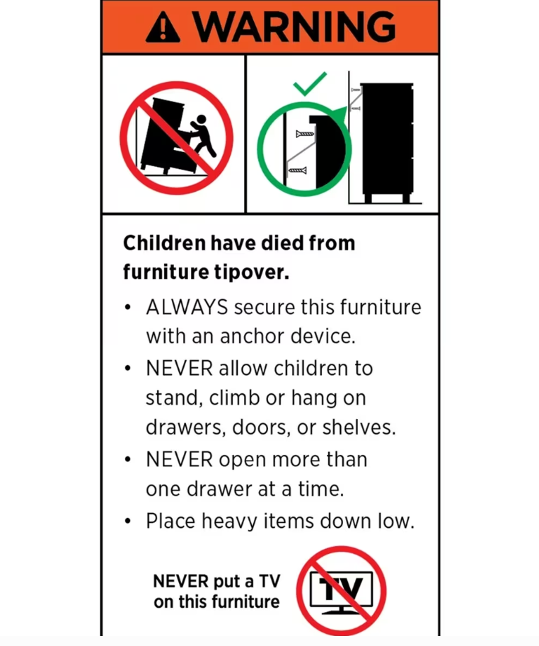 Warning: Toppling hazard. Please secure your furniture with the supplied wall fixing. Follow usage instructions carefully.